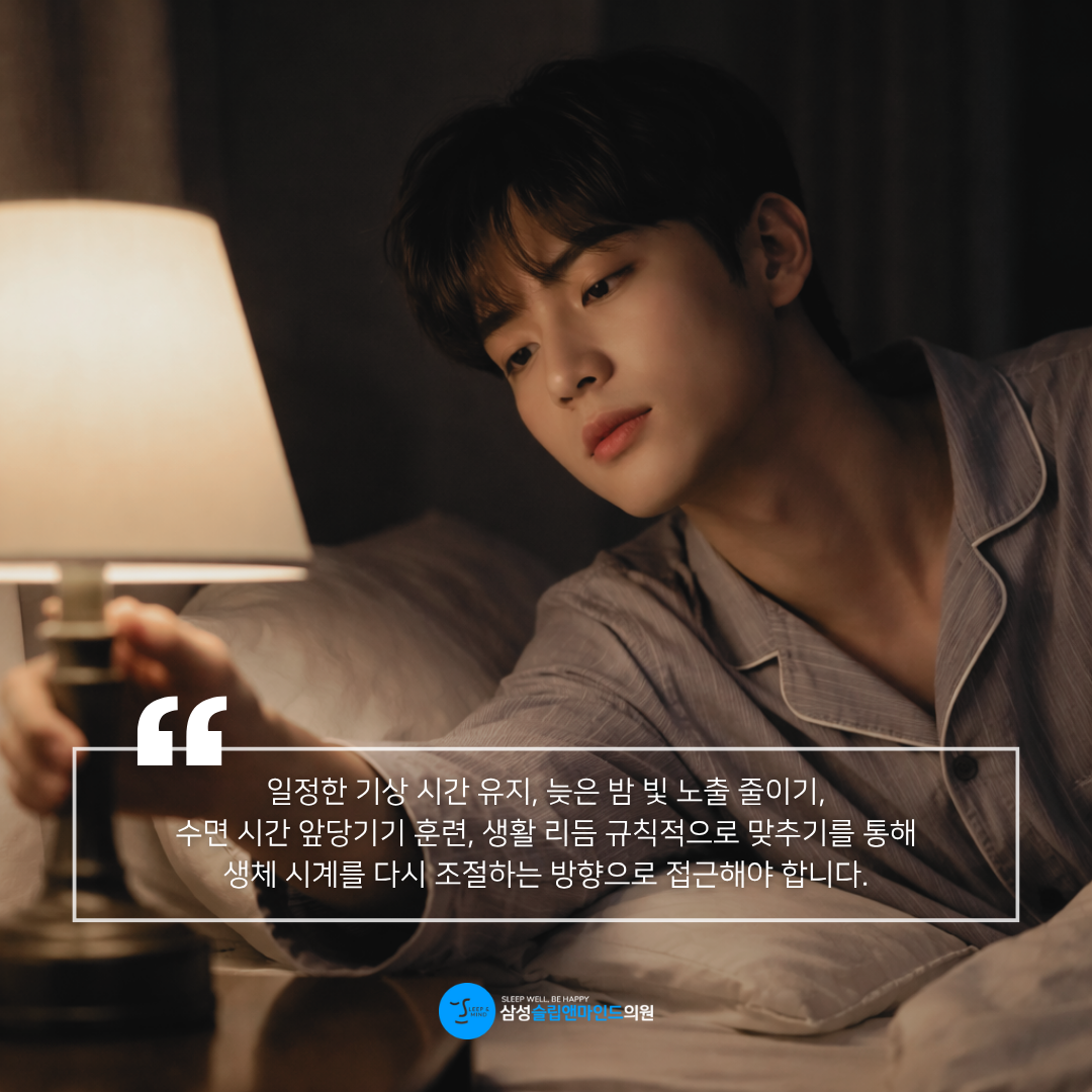 일정한 기상 시간을 유지하고, 늦은 밤 빛 노출을 줄이며, 수면 시간을 점진적으로 앞당기는 훈련과 생활 리듬을 규칙적으로 맞추는 접근이 중요합니다.